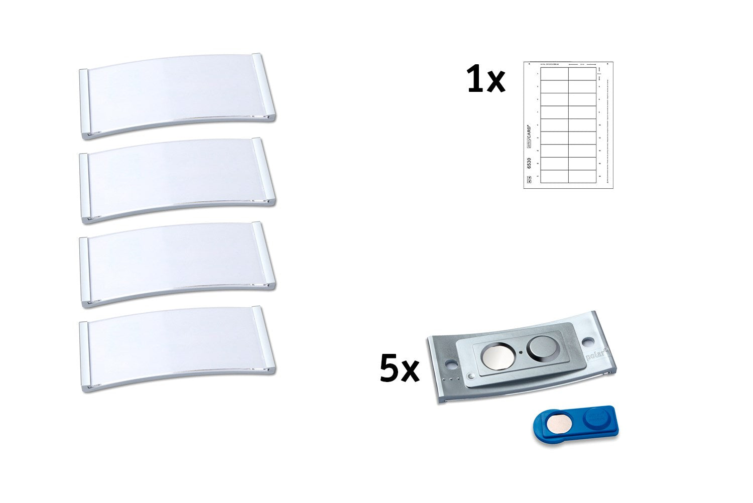 Sættet indeholder 5 navneskilte med stålramme og 18 Quick&Clean indstikskort.