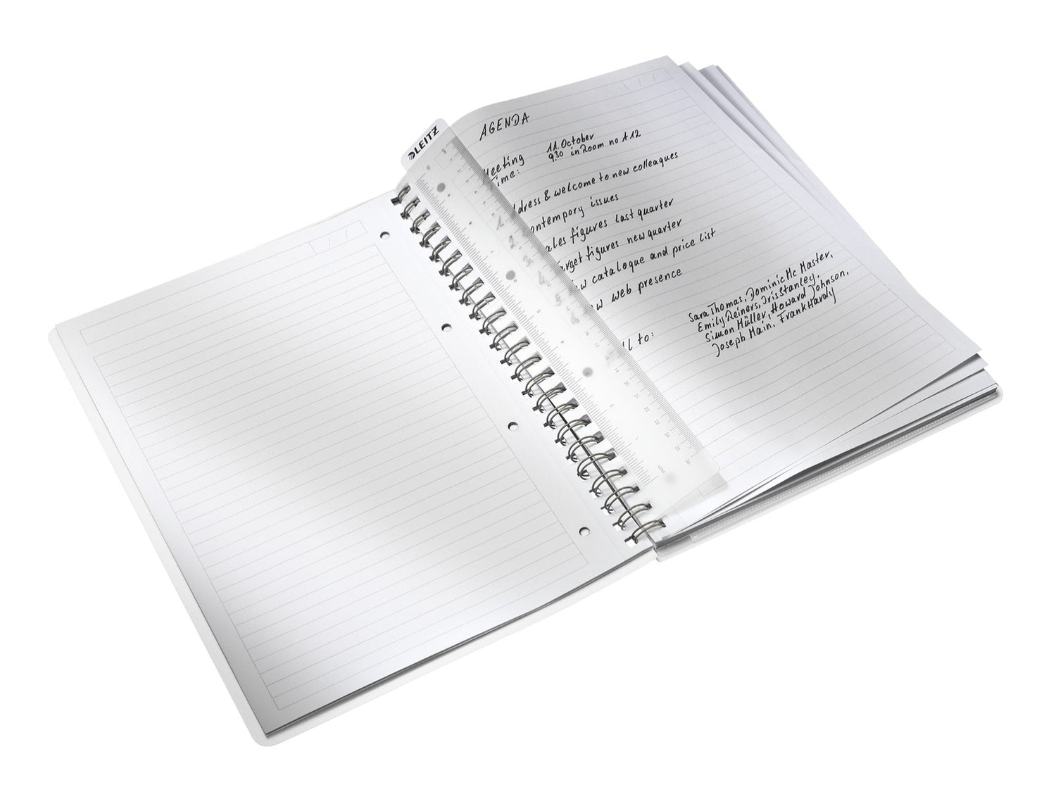 Notesbogen har et to farvet PP omslag, microperforerede og hullede ark, en aftagelig lineal, samt en transparent lomme til løse dokumenter eller noter.