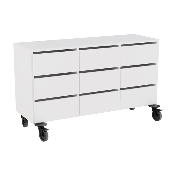 De 9 skuffer gør det nemt at organisere og holde styr på materialer i kontor, værksted eller undervisningsmiljø. Hjulene giver fleksibel placering og hurtig omrokering efter behov. Den hvide laminatoverflade er slidstærk og let at rengøre i daglig brug.