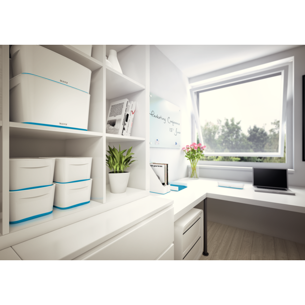 Leitz MyBox opbevaringsbakke tilføjer stil til dit hjem eller kontor med sin elegante tofarvede design og højglans finish. Denne robuste opbevaringsbakke, fremstillet i ridseafvisende og vandtæt plast, er ideel til skrivebords- eller skuffebrug.