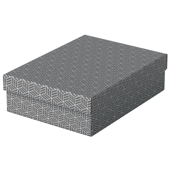 Stilfulde og moderne opbevaringsbokse i pap med aftageligt låg, der er ideel til indpakning af gaver eller til at skabe en hurtig opbevaringsløsning derhjemme. Sæt med tre kasser i samme størrelse til brug alene, til opbevaring på hylder eller i Cube reoler for at holde mindre genstande såsom fotografier og personlige dokumenter organiseret og nemme at finde. Tilføj noget bånd og brug den til at pakke en gave ind! Når den er åbnet, kan den genbruges af modtageren til opbevaring i hjemmet og giver dermed 2 gaver i 1. Fremstillet af stærkt, 100% genbrugt og 100% genanvendeligt pap, der er FSC-certificeret. Overfladen, som er let at tørre ren, har et geometrisk design i dobbelt farve, der tilføjer stil til din opbevaring. Leveres fladt pakket og er hurtig og nem at samle. Siderne foldes tilbage mod sig selv under samling for at give dobbelt styrke, hvilket sikrer, at æskerne forbliver stærke og beskytter indholdet.