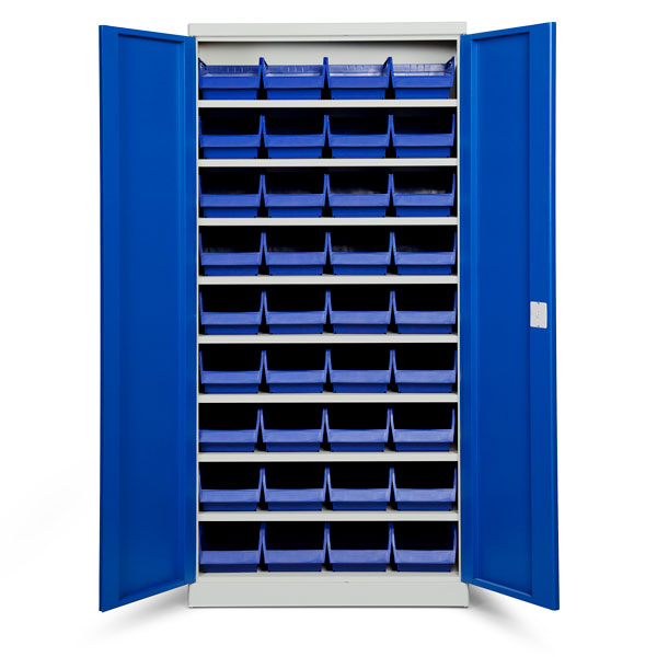 Opbevaringsskab ASPB model 1 er et kompletskab med plastkasser, bestående af det helsvejste stålskab ASHV med blå døre og størrelse 1980 x 980 x 570 mm, i kombination med nødvendig antal hylder og 36 stk blå modulbokse med d x b x h = 500 x 230 x 150 mm.