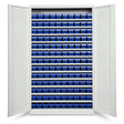 Skabet indeholder 130 plastkasser med dimensionerne 500 x 115 x 100 mm.