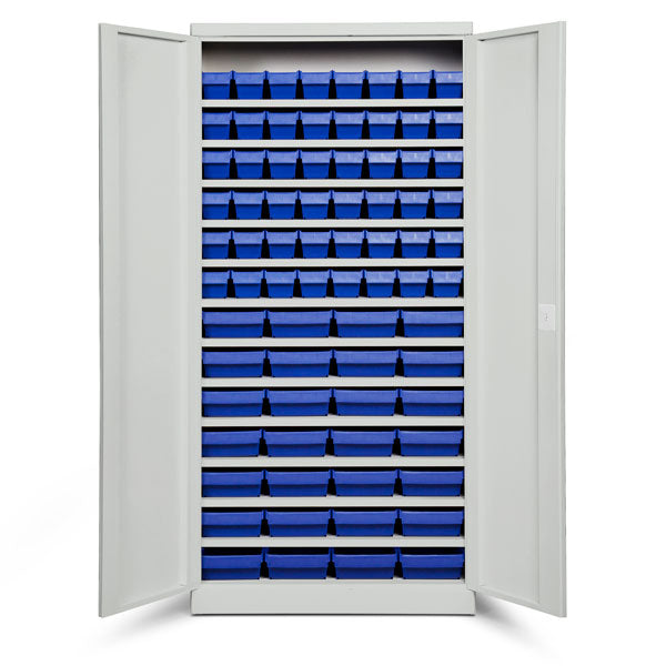 Opbevaringsskab ASPB model 4 er et kompletskab med plastkasser, bestående af det helsvejste stålskab ASHV med lysegrå døre og størrelse 1980 x 980 x 670 mm, i kombination med nødvendig antal hylder, 48 stk lagerkasser med størrelse 600 x 115 x 100 mm og 28 stk lagerkasser med størrelse 600 x 230 x 100 mm.