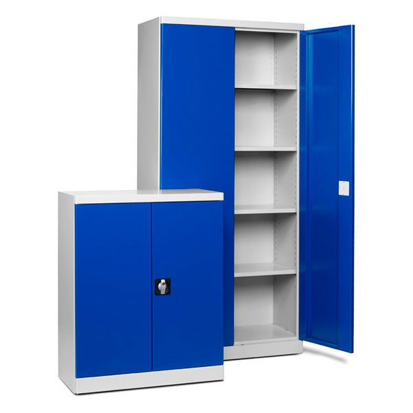 Opbevaringsskab 2 i 1, hvor du får to helsvejste opbevaringsskabe og kun betaler for det ene. Det største skab er 1980 x 900 x 440 mm, det mindste er 1000 x 800 x 400 mm. Begge har trepunktlås. Hyldebelastning 50 kg, jævnt fordelt. Begge skabe er komplet med flytbare hylder (4 +2). Lysgrå kabinet RAL 7035 og blå dørlåger RAL 5010.Specifikationer: