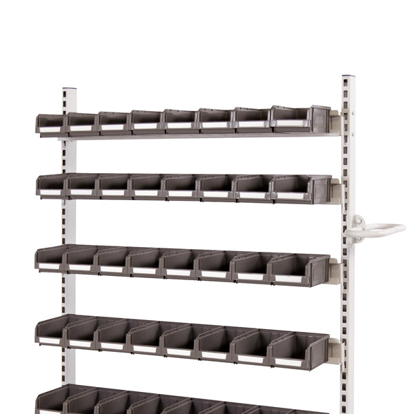 Skinnen har integrerede beslag for lige eller vinklet montering på vore perforerede søjler. Kapaciteten er 20 kg fordelt belastning. Plastkasser medfølger ikke og skal bestilles seperat.