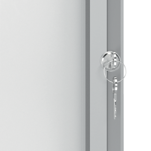 - Udendørs vejrbestandigt låsbart opslagsskab med hængslet låge i sikkerhedsglas og med sidelås