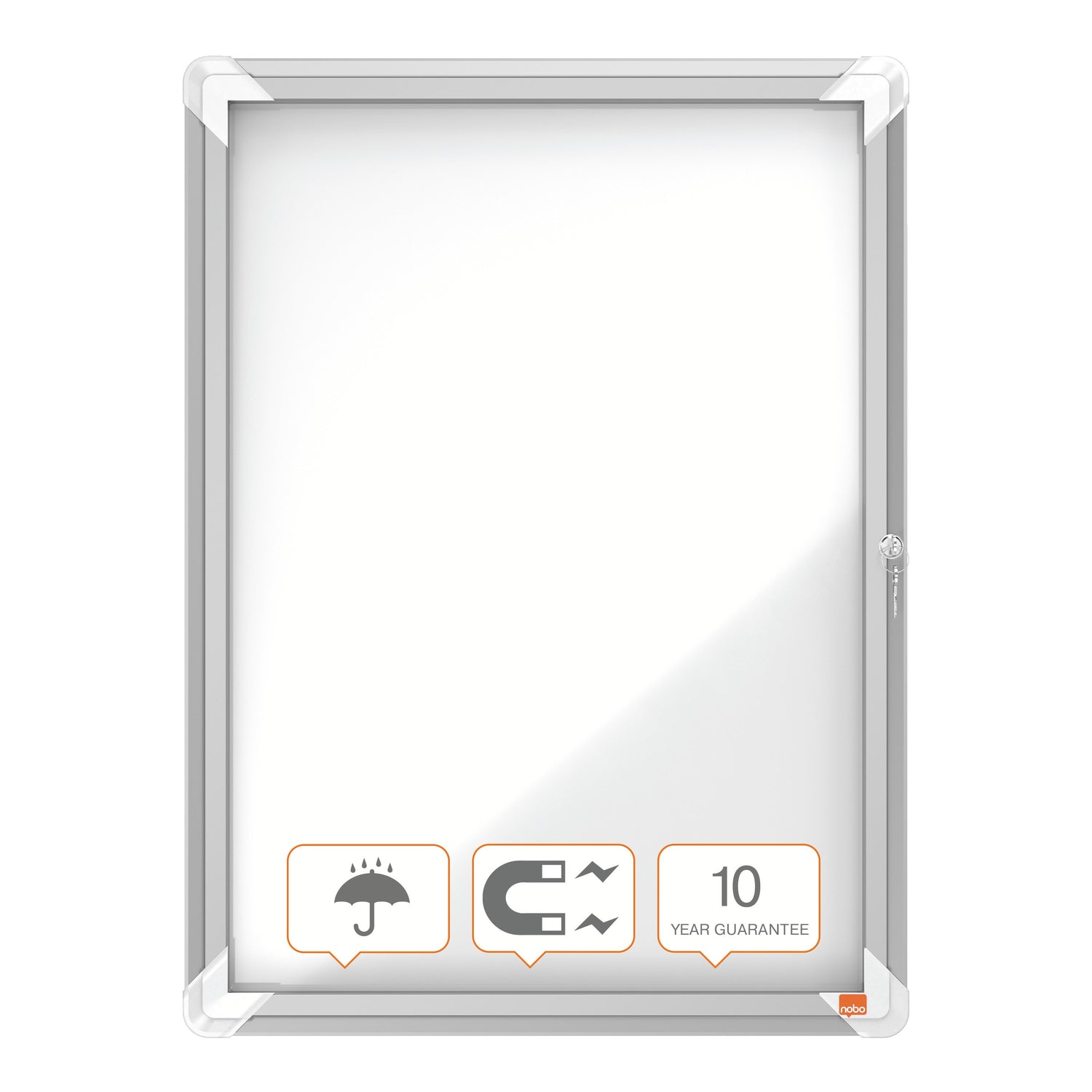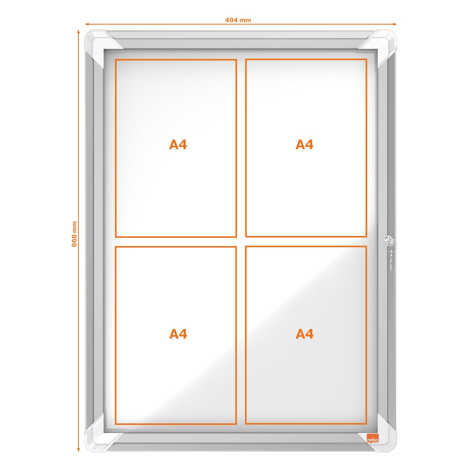 Magnetisk, udendørs låsbart opslagsskab med hængslet glaslåge og med sidelås. Komplet med moderne, stilfuld aluminumsramme og vægmonteres gennem hjørnerne. Magnetisk opslagstavle overflade til sikkert at vise dine opslag. Størrelse: 4xA4 ark. - Udendørs vejrbestandigt låsbart opslagsskab med hængslet låge i sikkerhedsglas og med sidelås - Magnetisk overflade for sikkert at vise opslag - Størrelse: 4xA4 ark, 494x668mm - Omkranset af en moderne, stilfuld aluminiumsramme - Vægmonteret gennem hjørnerne - 10 års garanti - Til udendørs brug