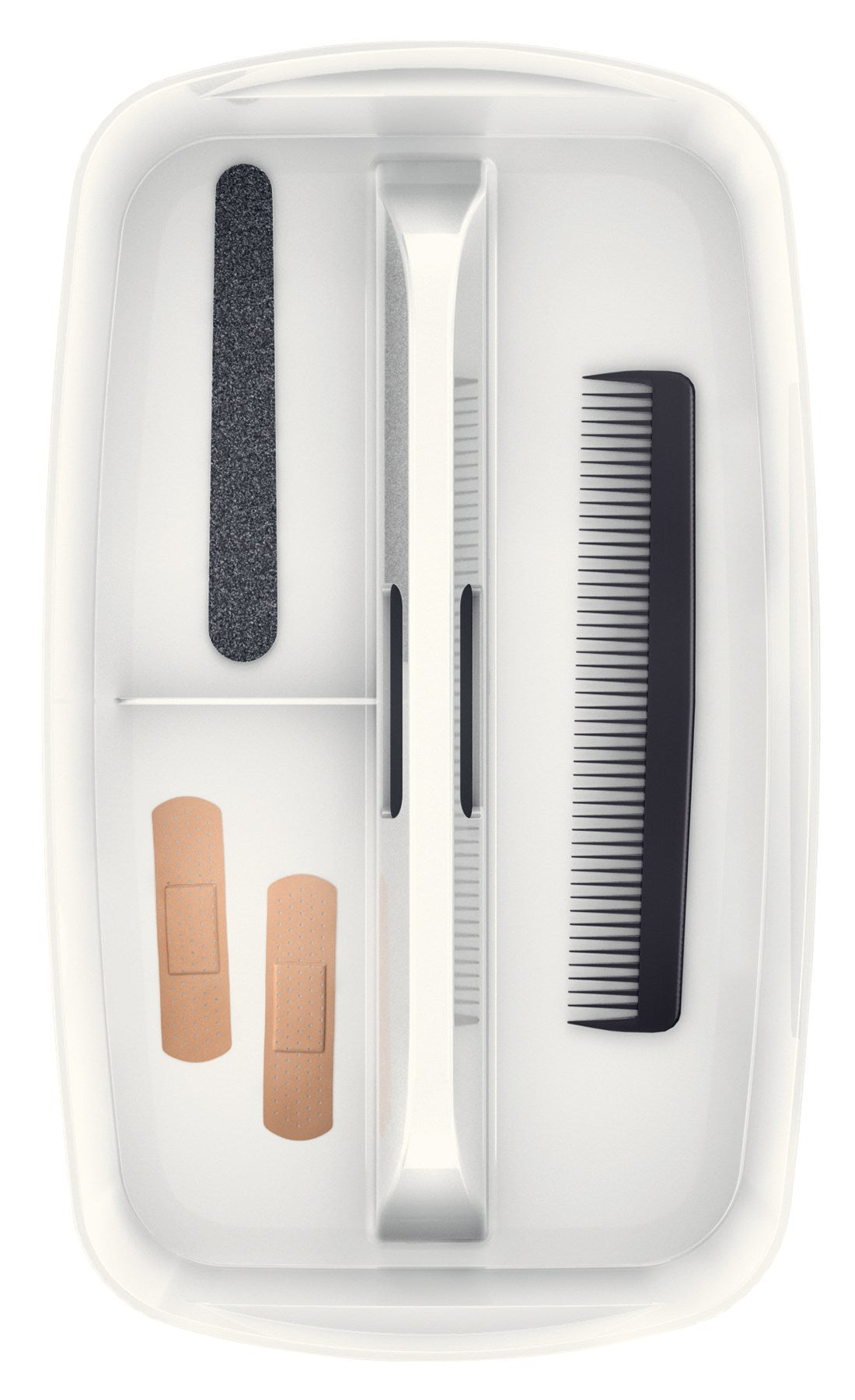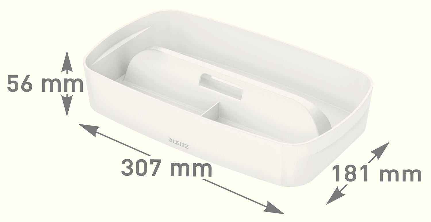 Bakken kan placeres inde i Leitz MyBox Large og Small, hvor den hviler på topkanten, uden at opbevaringspladsen nedenunder går tabt. Bakkerne kan også stables indeni hinanden for pladsbesparelse.