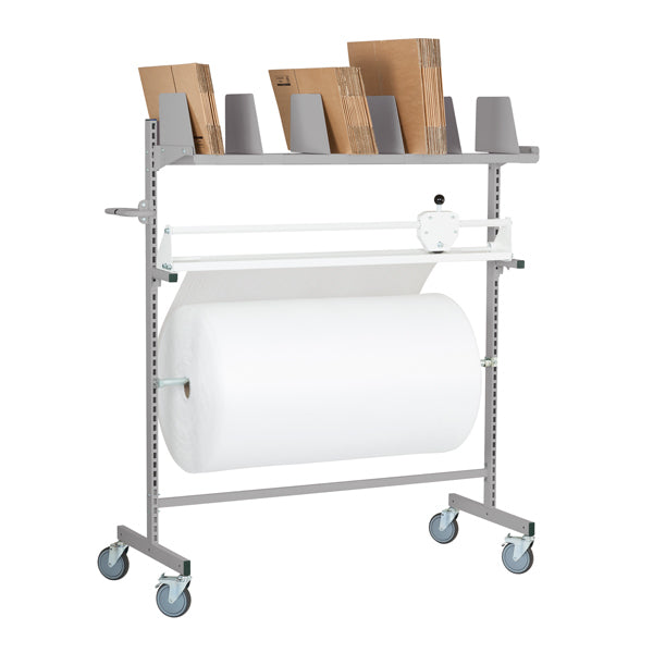 Komplet pakkevogn med h x b = 1655 x 1365 mm, inkluderet skæreaggregat med skærebredde 1000 mm, 1 stk hylde 1340 mm og 6 stk. hyldeafdeler/kartonstøtte samt aksel for pap, bobleplast, papir eller lignende.