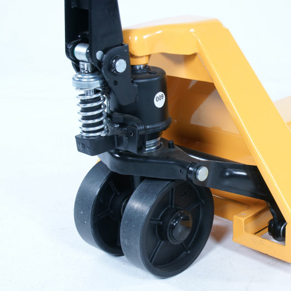 Palleløfteren har polyuretan boggiehjul, som er støjsvage, bløde, non-marking og skånsomme mod gulvet. Boggiehjulene fordeler vægten bedre og egner sig til ujævne overflader som ramper og tærskler.