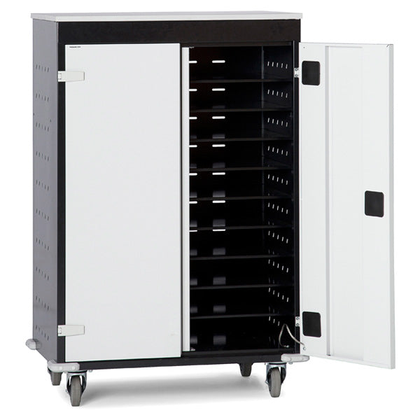 Praktiske mobile vogne/skabe for opbevaring og ladning af laptops og mobiltelefoner. Skabet har en solid konstruktion, to låsbare døre og en solid cylinderlås. Store letrullende, låsbare hjul og praktisk håndtag for enkel håndtering af vognen.