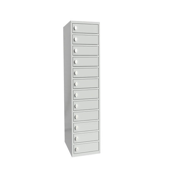 PC skab med el til opladning af laptop - bærbar computer. 12 rum i højden med lige tag. Pulverlakeret kabinet og døre. Lysgrå kabinet, RAL 7035, og lysgrå døre, RAL 7035. Levereres med færdigmonteret greb for hængelås i dørene. Dim (hxbxd): 1752 x 400 x 550 mm.