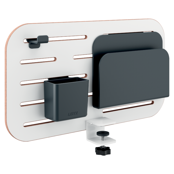 Hold dit skrivebord ryddeligt og få mest muligt ud af den tilgængelige plads med Leitz Ergo pegboard organiseringstavle. Disse unikke organiseringstavler til skrivebordet er nemme at montere ovenpå eller under et skrivebord eller bord og skaber øjeblikkelig opbevaring til alt fra headset til notesblokke og kuglepenne. Hold alle dine væsentlige ting organiseret, nemme at finde og frigør værdifuld plads på skrivebordet. Du skal blot placere det stærke opbevaringstilbehør i 85% recirkulerede plast (1 x notesblokholder, 1 x penneholder og 1 hængekrog til et headset) på organiseringstavlen for at skabe dit eget personlige arbejdsområde. Udviklet i Tyskland og kompatibel med de fleste skriveborde med en maksimal bordpladetykkelse på 35 mm, er pegboard-organiseringstavlen nem at installere og en værdifuld tilføjelse til Leitz Ergo hæve-sænke skriveborde (65340001 eller 65360001). Tavlen er lavet af slidstærkt 8 mm MDF for at sikre styrke og stabilitet, og bløde gummipuder beskytter skrivebordets overflade mod ridser. Denne moderne og minimalistiske pegboard-organiseringstavle er ideel til dit hjem eller kontor for at forbedre komforten og maksimere produktiviteten. Det er vores mission at levere løsninger, der kan give mennesker mulighed for at trives på arbejdet og derudover fremme positiv mental sundhed og fysisk velbefindende. Kombiner med mange andre Leitz Ergo-produkter for at skræddersy din fleksible og individuelle sid, stå & bevæg-arbejdsstation. Hold dig aktiv og HAV DET GODT med Leitz.