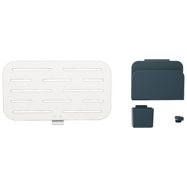 - Tre stk. tilbehør til organiseringstavlen medfølger; alt lavet af 85% recirkuleret plast: 1 x notesbogholder, 1 x penneholder og 1 hængekrog til et headset