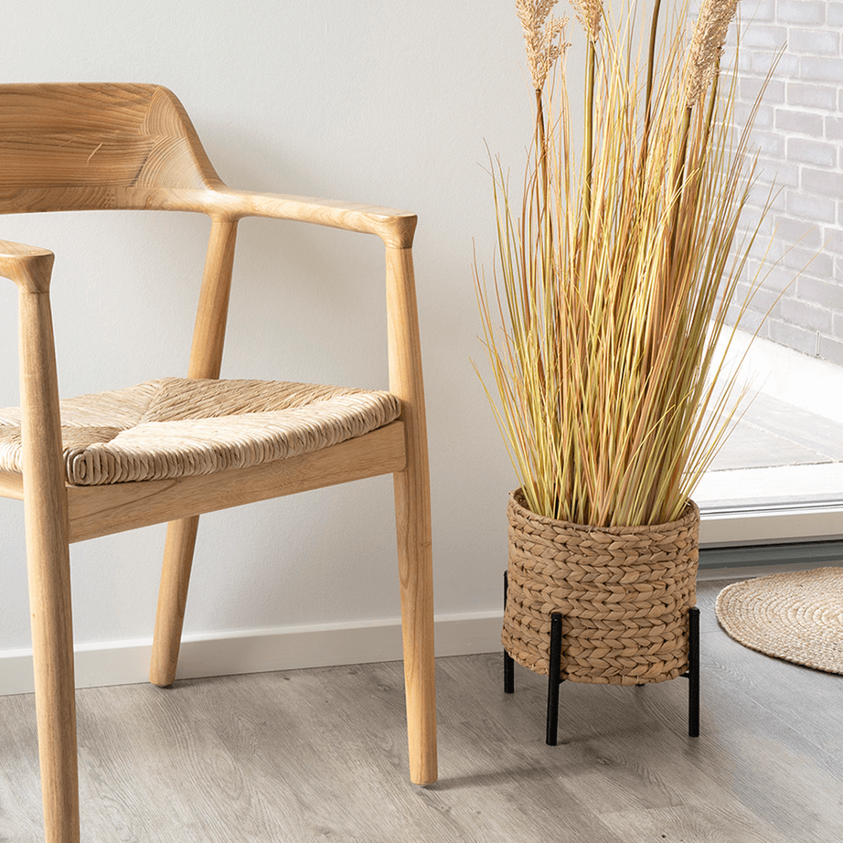 Planteskjuler i vandhyacint og sort metal Bring naturen ind i dit hjem med denne smukke, runde planteskjuler i flettet vandhyacint. Planteskjulerens neutrale farve og minimalistiske udseende passer til mange forskellige indretningsstile, især den skandinaviske. Det sorte metalstativ løfter planteskjuleren fra gulvet og skaber et elegant og let udtryk, der samtidig beskytter dine gulve mod fugt. Planteskjuleren er ligeledes foret med plastik indvendigt, så du kan vande din plante uden bekymring. Størrelsen på planteskjuleren er ideel til mellemstore planter. Diameter ca. 23,5 cm. Højde ca. 28 cm. inkl. stativGør dine planter til en æstetisk del af dit interiør med denne planteskjuler i vandhyacint og sort metal. Perfekt til dig, der ønsker at tilføje et naturligt og stilrent Touch til dit hjem. Bestil i dag, og transformér din stue med denne tidløse og funktionelle planteskjuler.