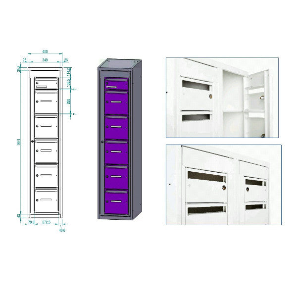 Skabe til sortering af dagens post, informationsfordeling m.m. Skabene er med et solidt, helsvejst stålkabinet. Både kabinet og låger er pulverlakeret lysegråt RAL 7035. Skabet kræver ingen montering, kan evt. sættes på et understel (sokkel) og kan tages i brug øjeblikkeligt. Postsorteringsskabene er med cylinderlås, centrallås og lige tag.