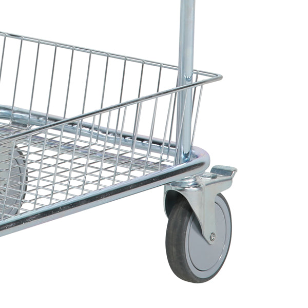 Klassisk el-galvaniseret kurvevogn / postvogn med plasthåndtag. Vognen er meget populær til butikker, skoler, kontorer og let lagerplukning. Især populær i butikkerne, fordi den er fleksibel i trange rum, kurvene rummer meget og holder varerne på plads. Vognen er udstyret med 4 stk. drejelige hjul heraf 2 stk. er udstyret med bremse, hvilket er meget praktisk ved ind- og udlæsning af vognen.