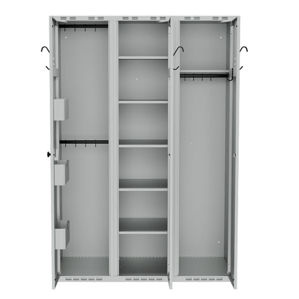 Midtersektionen og højre sektion har højrehængte døre forberedt til lås, og der kan vælges Eurolock og ASSA cylinderlås eller greb til hængelås til skabet.