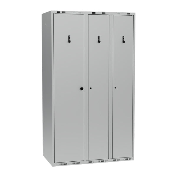 De midterste og højre sektioner er forberedt til lås, og skabet kan udstyres med Eurolock, ASSA cylinderlås eller greb til hængelås.