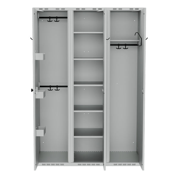 Den midterste og højre sektion har højrehængte døre forberedt til lås, mens den venstre sektion har venstrehængt dør uden låsefunktion.