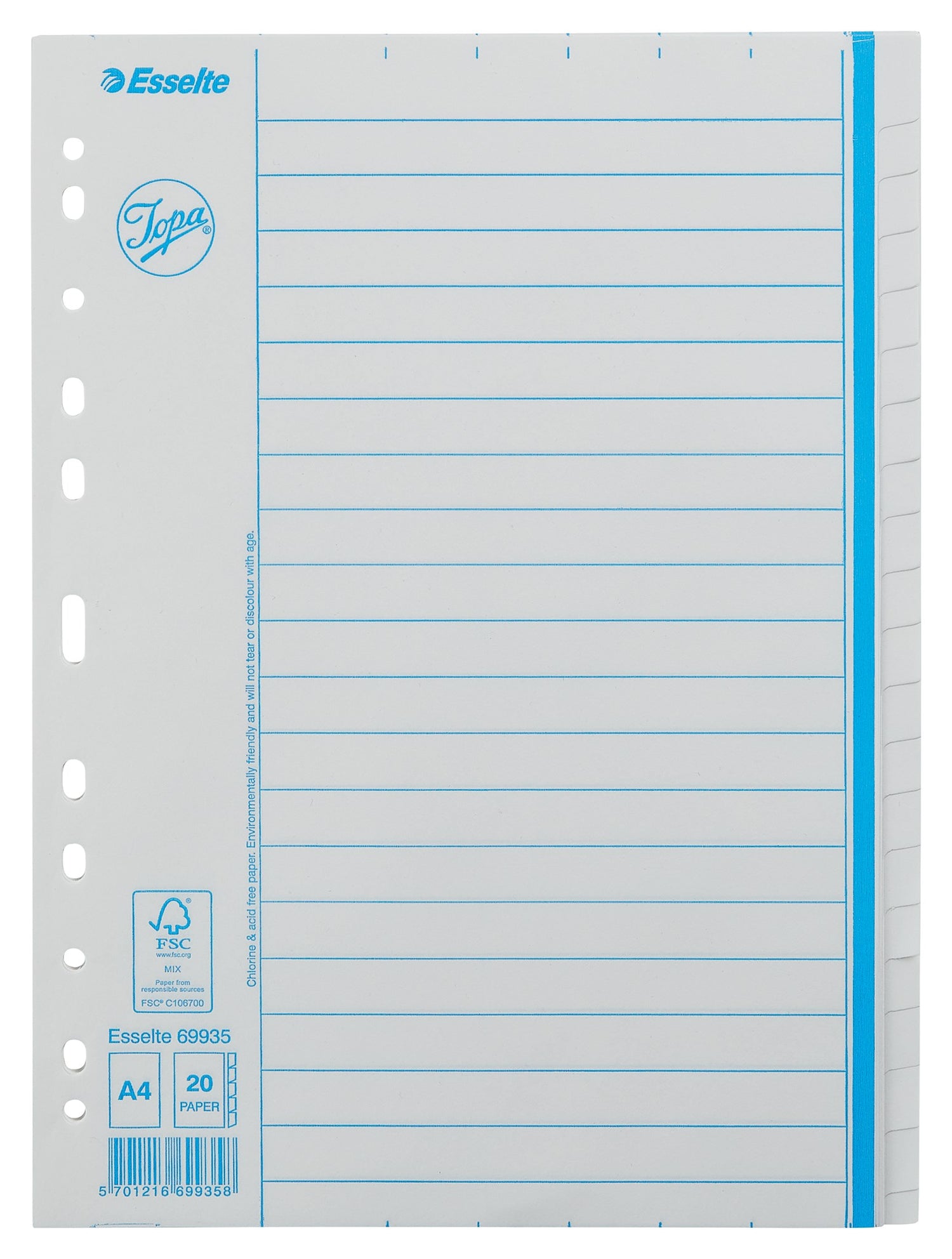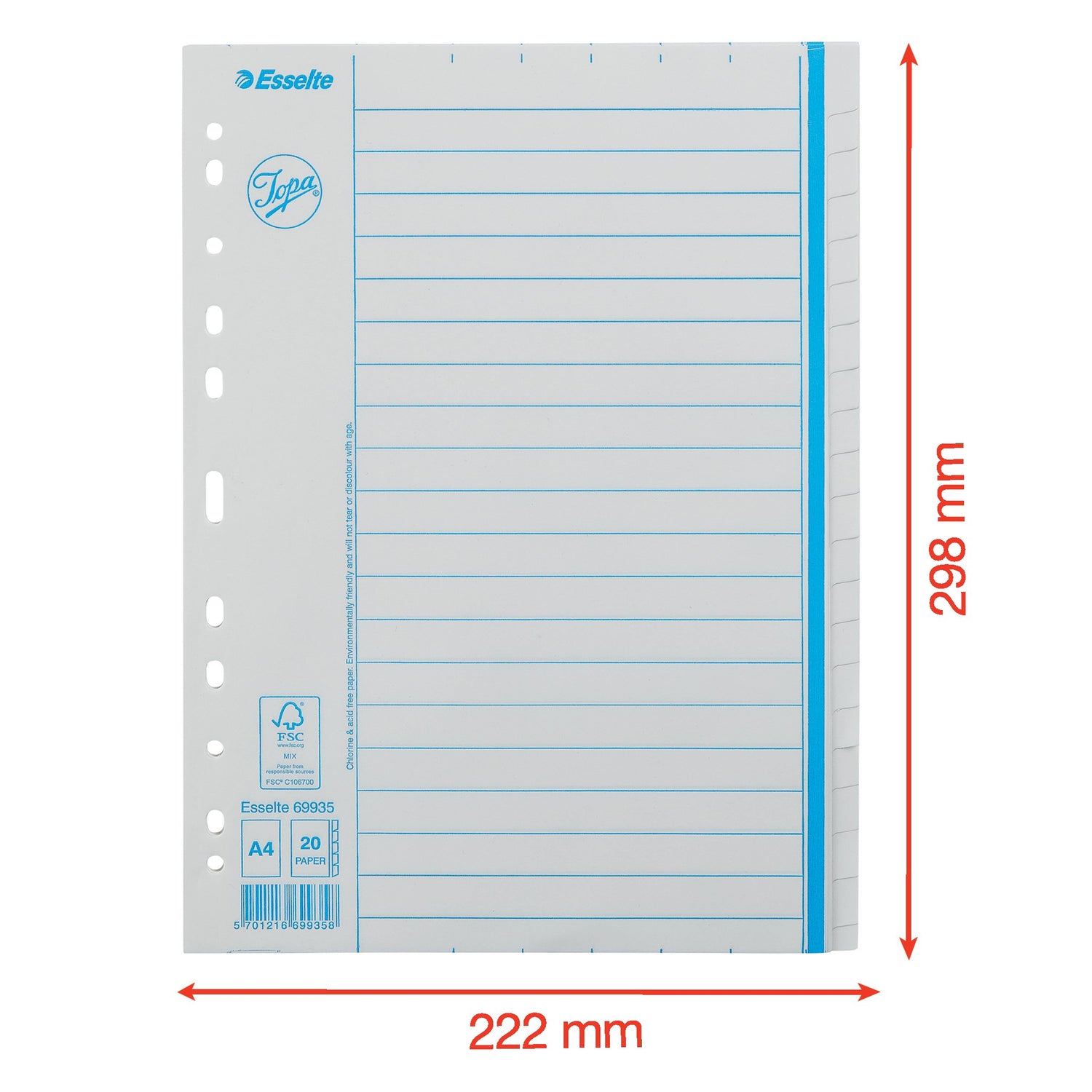 Registeret har formatet A4 med dimensionerne 22,2 mm i bredde, 0,3 mm i højde og 29,8 mm i dybde.