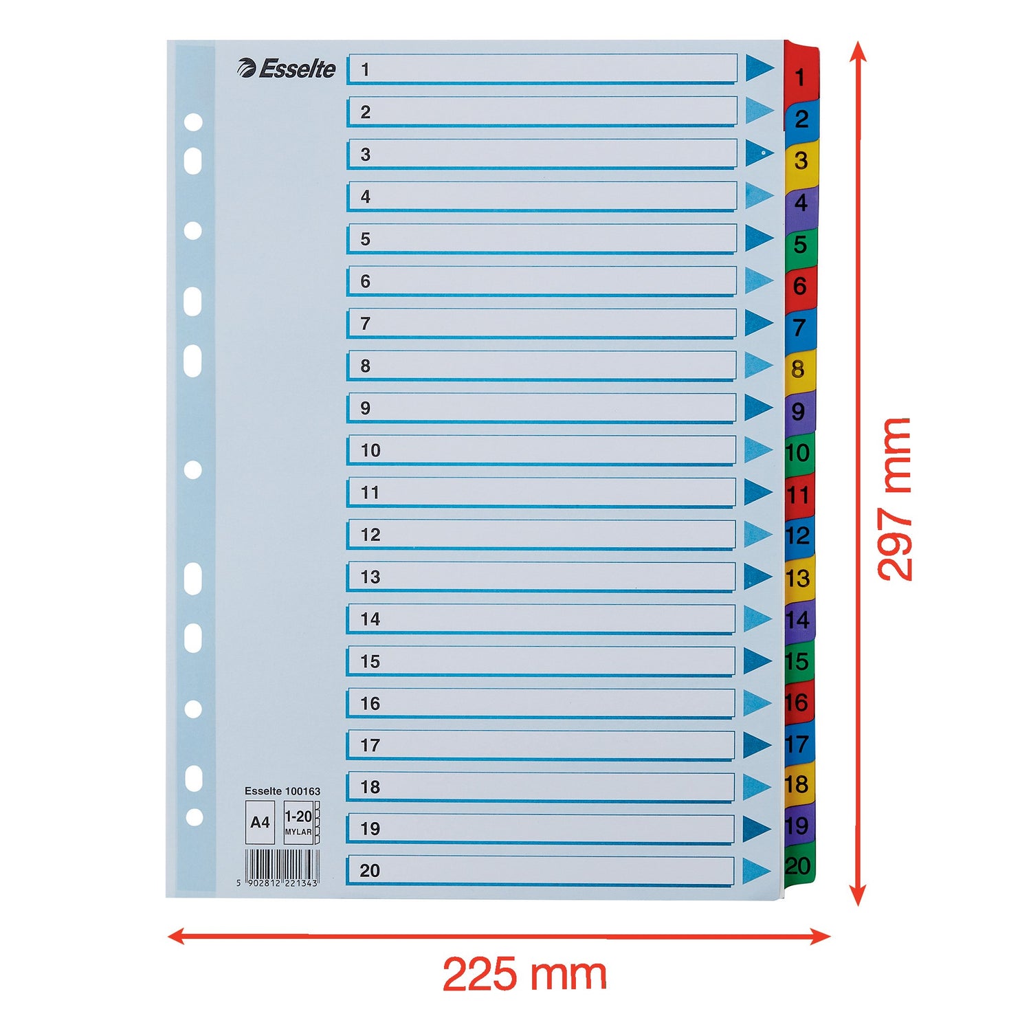 Registeret indeholder 20 farvede faner, printet 1-20 for nem sortering.