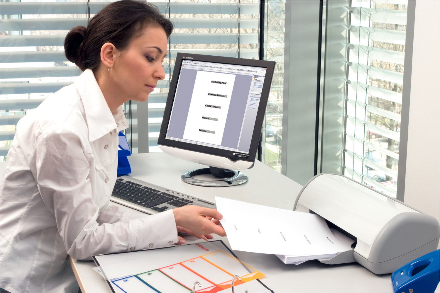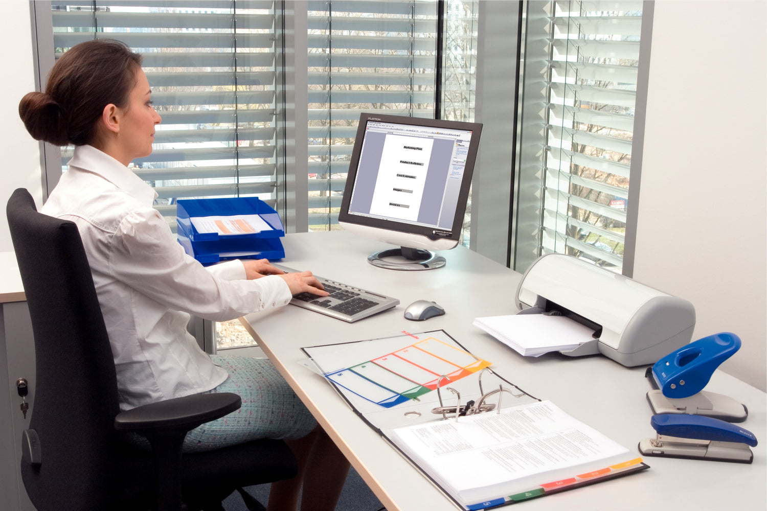 De nye Esselte projektregistre til PC-udskrivning hjælper dig med at bevare en struktureret orden. Man printer ikke direkte på forsiden, men på et almindeligt stykke A4-papir og placerer det bag det første ark i registret, som er transparent. En Word-skabelon, som kan downloades gratis, har præcise felter, som passer ind i skrivefelterne.