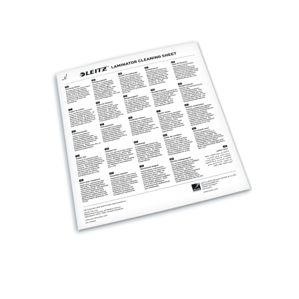 Leitz renseark til lamineringsmaskiner er ideelle til skoler og kontorer med hyppig laminering. Disse A4-ark fjerner effektivt klæbemiddel og snavs fra lamineringsrullerne, hvilket forhindrer papirstop og forlænger maskinens levetid.