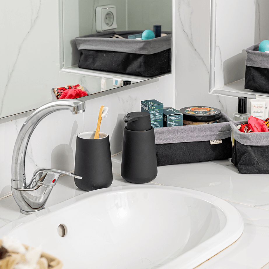 Sort sæbedispenser i keramik til badeværelset eller køkkenet. Den matte overflade og de rene linjer giver et tidløst udtryk, som passer perfekt til moderne nordisk indretning. Sæbedispenseren rummer 300 ml sæbe og er udstyret med en praktisk pumpe, der gør det nemt at dosere den rette mængde sæbe. Den solide keramiske konstruktion sikrer høj holdbarhed og giver en tyngde, der gør, at dispenseren står stabilt på bordet eller vasken.