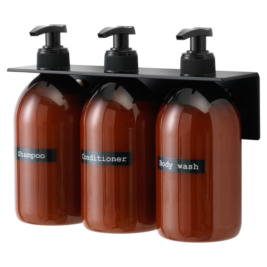 Med en sæbeholder til væggen kan du frigøre plads omkring håndvasken eller i badet og sørge for, at din sæbe, shampoo eller balsam altid er lige ved hånden. Denne sorte sæbeholder er designet til tre flasker og er fremstillet i rustfrit stål. Materialet er modstandsdygtigt over for fugt og nemt at holde rent, hvilket gør sæbeholderen ideel til vådrum. Sæbeholderen monteres nemt med to skruer, og de medfølgende dækpropper sørger for, at skruerne er skjult, så udtrykket forbliver elegant og minimalistisk.