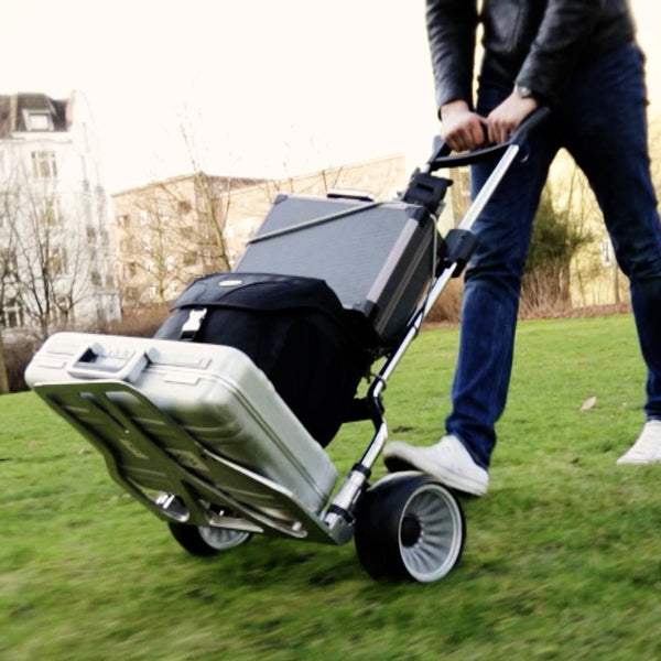 RuXXac® Cross sækkevogn i aluminium med ekstra brede hjul, der gør det nemt at køre på ujævnt og blødt underlag. Med patenteret foldeteknologi er den yderst pladsbesparende sammenfoldet og klar til brug på få sekunder. Vognen har en lastkapacitet på 75 kg og et unikt lastsikringssystem, der sikrer lasten perfekt. Udstyret med punktersikre, massive gummihjul og stel i forkromet stål. Vægten er kun 6,3 kg.
