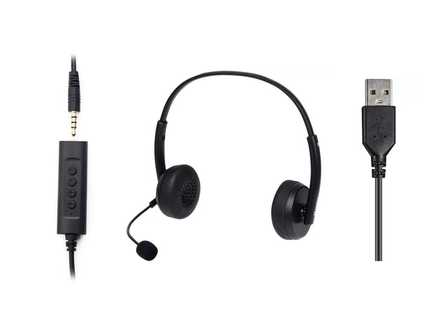Headsettet kan tilsluttes til computere via USB og til smartphones eller tablets via MiniJack.