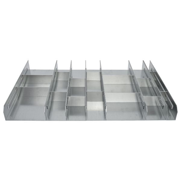 Hver skuffeindretning leveres med følgende: 2 række 214x70 mm, 4 rækker 107x70 mm og 1 række 53x70 mm. Der medfølger 2 tværplader pr. række.