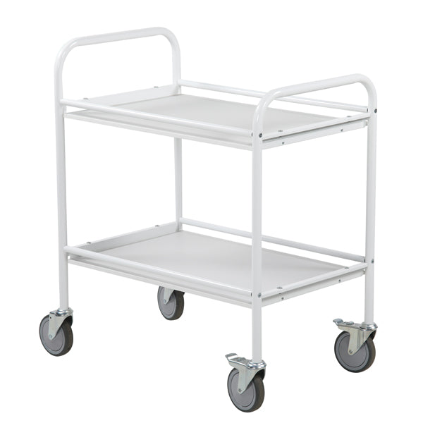 Hvid bordvogn / serveringsvogn med 2 stk 510 x 710 mm hylder. Kraftig understel i stål og 10 mm limet laminatplade. Kapaciteten er 150 kg jævnt fordelt (75 kg pr. hylde). Afstand mellem hylderne er 355 mm. Leveres usamlet inkl. 4 drejelige gummihjul, heraf 2 med bremse.Specifikationer: