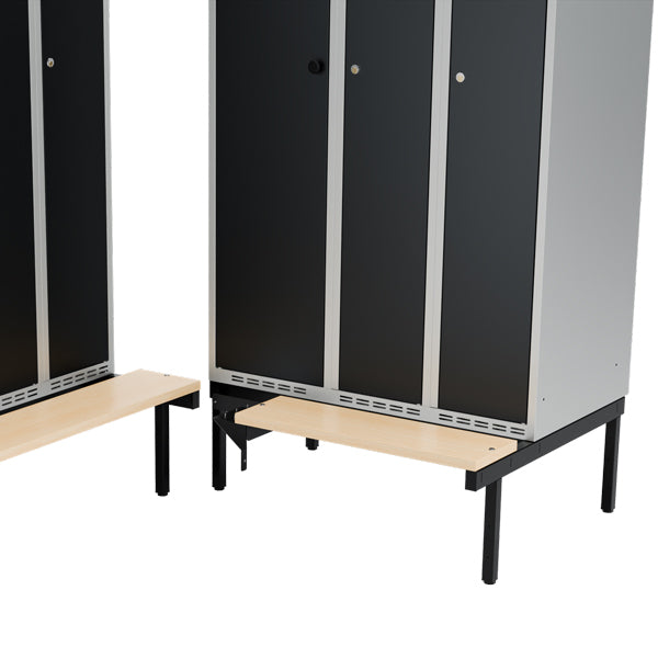 Bænkstellet leveres med justerskruer til ujævne gulve, i sortlakeret udførelse med bænksæde i birk laminat (F7921), og monteres nemt. Bænkstellet har en højde på 320 mm, og er beregnet til montering i hjørnekombination med andre standard siddebænke.