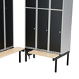 Bænkstellet leveres med justerskruer til ujævne gulve, i sortlakeret udførelse med bænksæde i birk laminat (F7921), og monteres nemt. Bænkstellet har en højde på 320 mm, og er beregnet til montering i hjørnekombination med andre standard siddebænke.