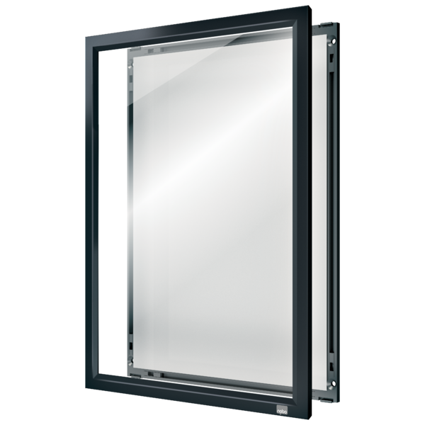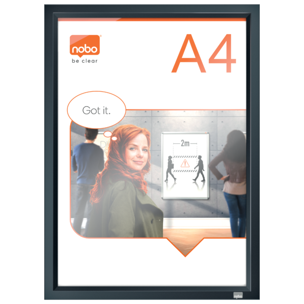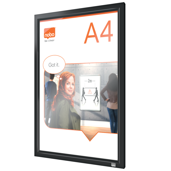 Denne vægmonterede skifteramme/skilteholder har en stilfuld lavprofil klikramme, hele ubrudte hjørner og en meget innovativ måde at skifte indhold på. Du skal blot tage frontrammen af, udskifte indholdet bag den gennemsigtige front og genplacere rammen med et simpelt tryk/klik. Denne stabile og sikre skilteløsning har et bagpanel, der fastgøres til væggen ved hjælp af gennemgående hjørnemonteringsskruer. Det giver dig mulighed for at udskifte indholdet uden at fjerne rammen fra væggen. Det innovative design forbedrer en traditionel produktløsning ved at gøre dokumentudskiftning til en hurtig og enkel proces. Visningsområdet er til A4 størrelse.