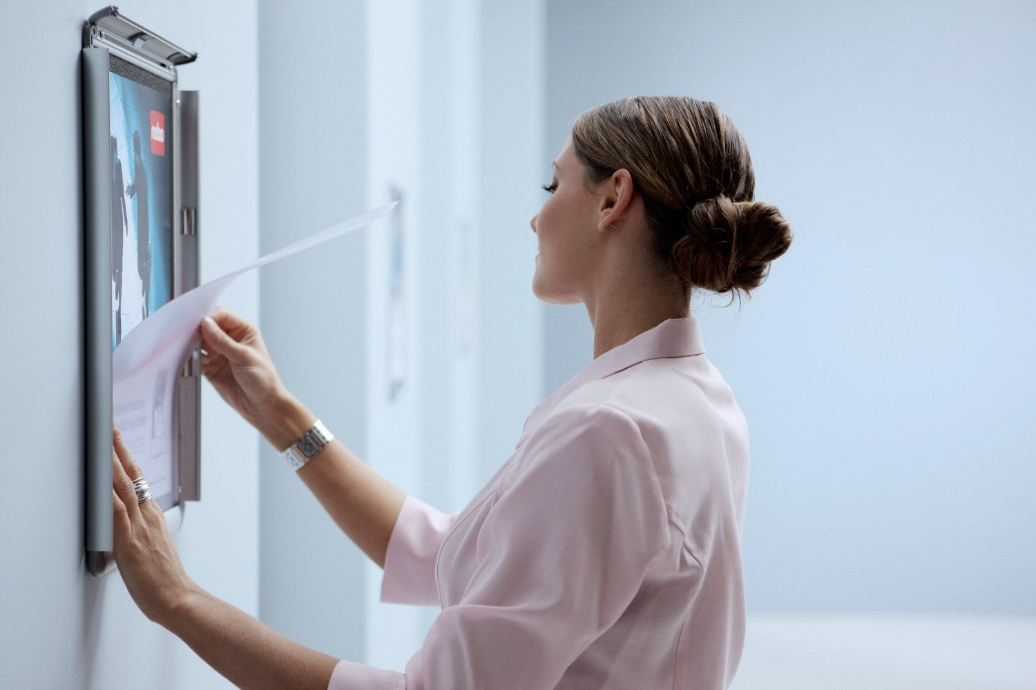 Skifterammen er i A4-størrelse, velegnet til beskeder, menuer og anden information.