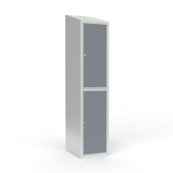 Skoleskab 1x400 Skråt tag 2 rum i højden Lys grå laminatdør Greb for hængelås