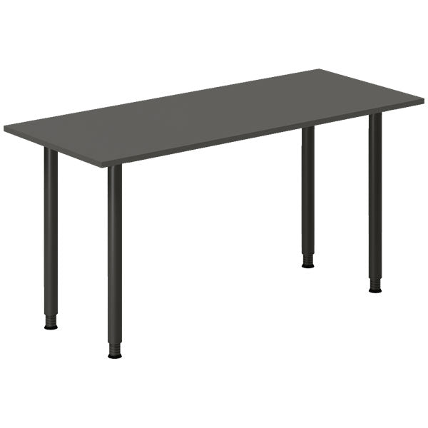 DNA skrivebord med 1400 x 600 mm bordplade i antracit laminat.I DNA-kontormøbelserien finder du standardborde med sorte I-ben og manuel justering af arbejdshøjde (650 - 800 mm). Skrivebordet har 25 mm laminatbordplade for god stabilitet.