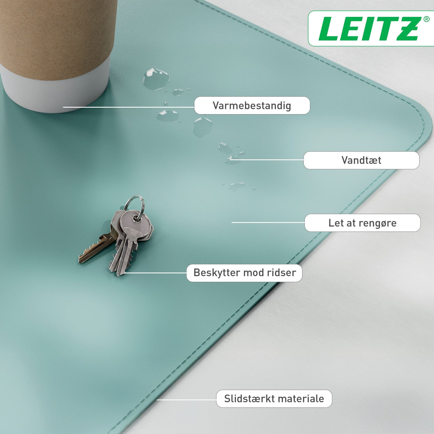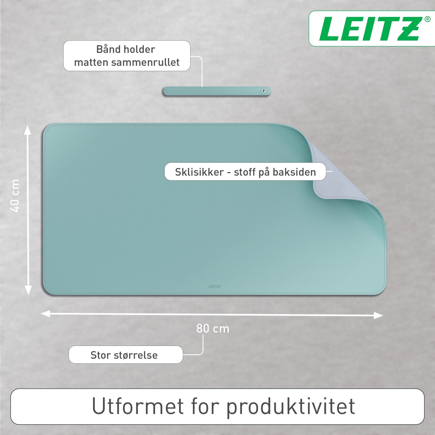 Forbliv produktiv og føl dig godt tilpas, uanset hvor din arbejdsdag bringer dig hen, med Leitz Large skriveunderlag. Det er en vandtæt skrivebordsbeskyttelsesmåtte, der er nem at rengøre, og som holder dit skrivebord pænt. Den store overflade på 80 x 40 giver plads til tastatur, mus, notesblok og tilbehør og beskytter dit skrivebord mod ridser, pletter, spild og skrammer. Kompatibel med al laser- og optisk musesporing. Kan rulles sammen med en strop, der holder den fast, så den er nem at transportere og dele på skrivebordet. Plastfri emballage. Indbydende mat farve med et minimalistisk design og afrundede hjørner. Multifunktionel brug som skriveunderlag og musemåtte, hvilket gør den velegnet til både arbejde og fritid. HAV DET GODT med Leitz. - Let at rengøre, vandtæt skrivebordsbeskyttelsesmåtte til at holde dit skrivebord ryddeligt - Stor overflade på 80 x 40 cm med plads til tastatur, mus, notesblok og tilbehør - Kompatibel med alle laser og optiske musesporingssystem