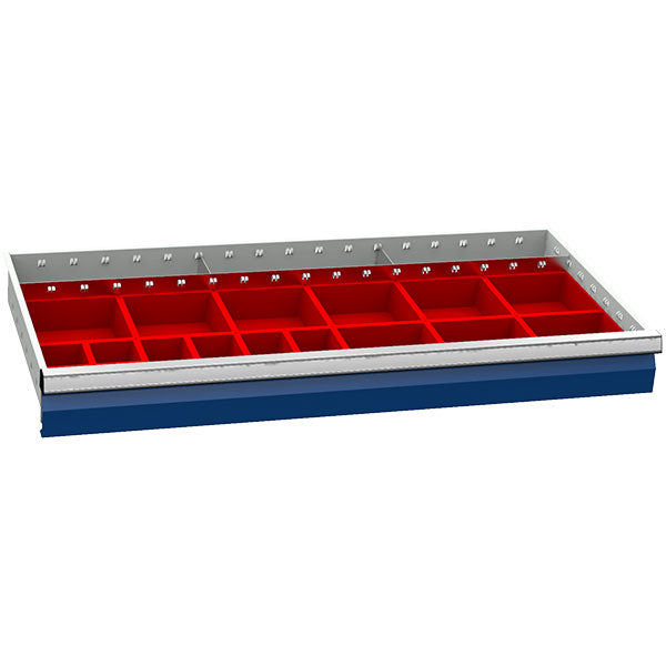 Leveres med 17 x plastkasser, røde samt 2 dybdegående og 1 tværgående skilleplade
