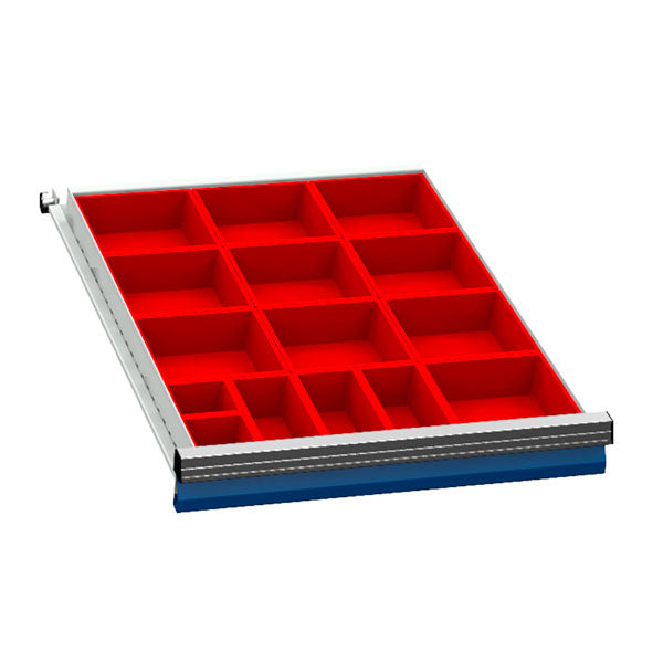 Praktisk skuffeindretning produceret i plast, til brug i vore skuffesektioner i størrelse b x d = 555 x 736 mm / værktøjskuffer med indvendig størrelse 450 x 600 mm. Inddelingen er tilpasset skuffer med højde 100 mm, og kan justeres således at du kan indrette dine skuffesektioner tilpasset akkurat dit behov.Specifikationer: