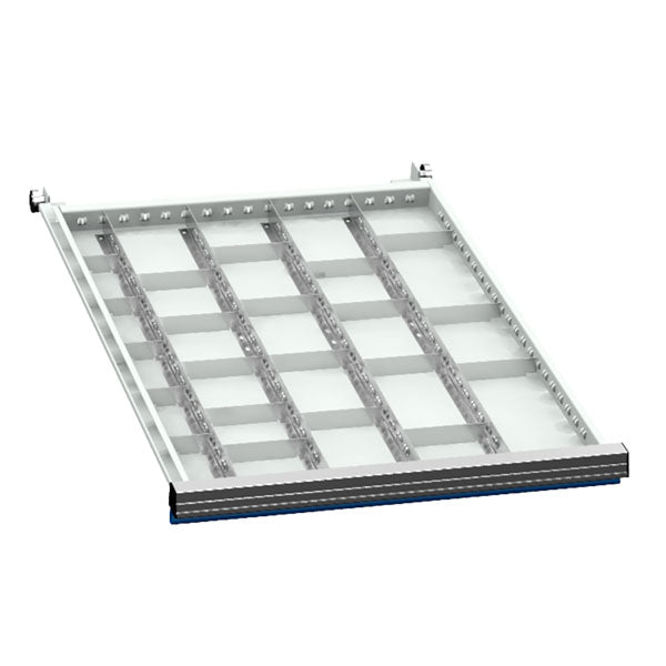 Praktisk skuffeindretning produceret i galvaniseret stål, til brug i vore skuffesektioner i størrelse b x d = 555 x 736 mm / værktøjskuffer med indvendig størrelse 450 x 600 mm. Inddelingen er tilpasset skuffer med højde 150/175 mm, og kan justeres således at du kan indrette dine skuffesektioner tilpasset akkurat dit behov.Specifikationer: