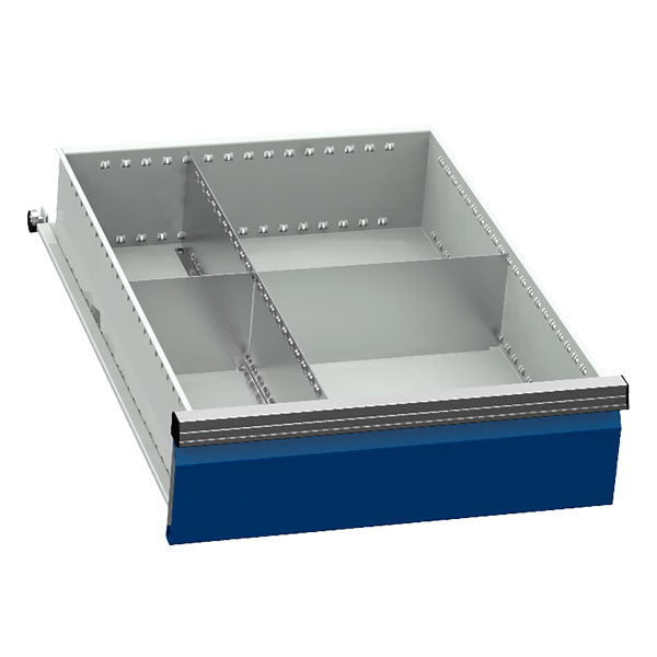Praktisk skuffeindretning produceret i galvaniseret stål, til brug i vore skuffesektioner i størrelse b x d = 555 x 736 mm / værktøjskuffer med indvendig størrelse 450 x 600 mm. Inddelingen er tilpasset skuffer med højde 100/125 mm, og kan justeres således at du kan indrette dine skuffesektioner tilpasset akkurat dit behov.Specifikationer: