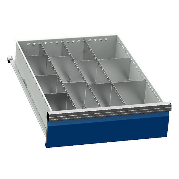 Praktisk skuffeindretning produceret i galvaniseret stål, til brug i vore skuffesektioner i størrelse b x d = 555 x 736 mm / værktøjskuffer med indvendig størrelse 450 x 600 mm. Inddelingen er tilpasset skuffer med højde 50 mm, og kan justeres således at du kan indrette dine skuffesektioner tilpasset akkurat dit behov.Specifikationer: