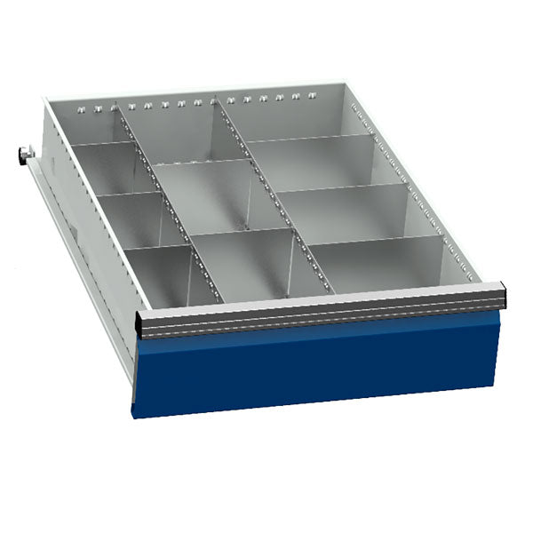 Praktisk skuffeindretning produceret i galvaniseret stål, til brug i vore skuffesektioner i størrelse b x d = 555 x 736 mm / værktøjskuffer med indvendig størrelse 450 x 600 mm. Inddelingen er tilpasset skuffer med højde 75 mm, og kan justeres således at du kan indrette dine skuffesektioner tilpasset akkurat dit behov.Specifikationer: