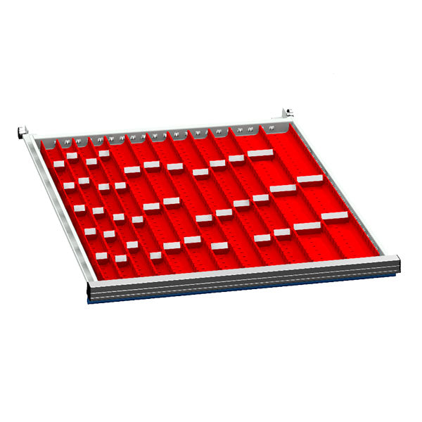 Praktisk skuffeindretning produceret i plast, til brug i vore skuffesektioner i størrelse b x d = 705 x 736 mm / værktøjskuffer med indvendig størrelse 600 x 600 mm. Inddelingen er tilpasset skuffer med højde 50/75 mm, og kan justeres således at du kan indrette dine skuffesektioner tilpasset akkurat dit behov.Specifikationer: