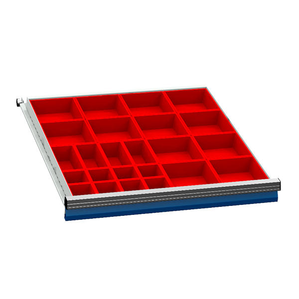 Praktisk skuffeindretning produceret i plast, til brug i vore skuffesektioner i størrelse b x d = 705 x 736 mm / værktøjskuffer med indvendig størrelse 600 x 600 mm. Inddelingen er tilpasset skuffer med højde 100 mm, og kan justeres således at du kan indrette dine skuffesektioner tilpasset akkurat dit behov.Specifikationer: